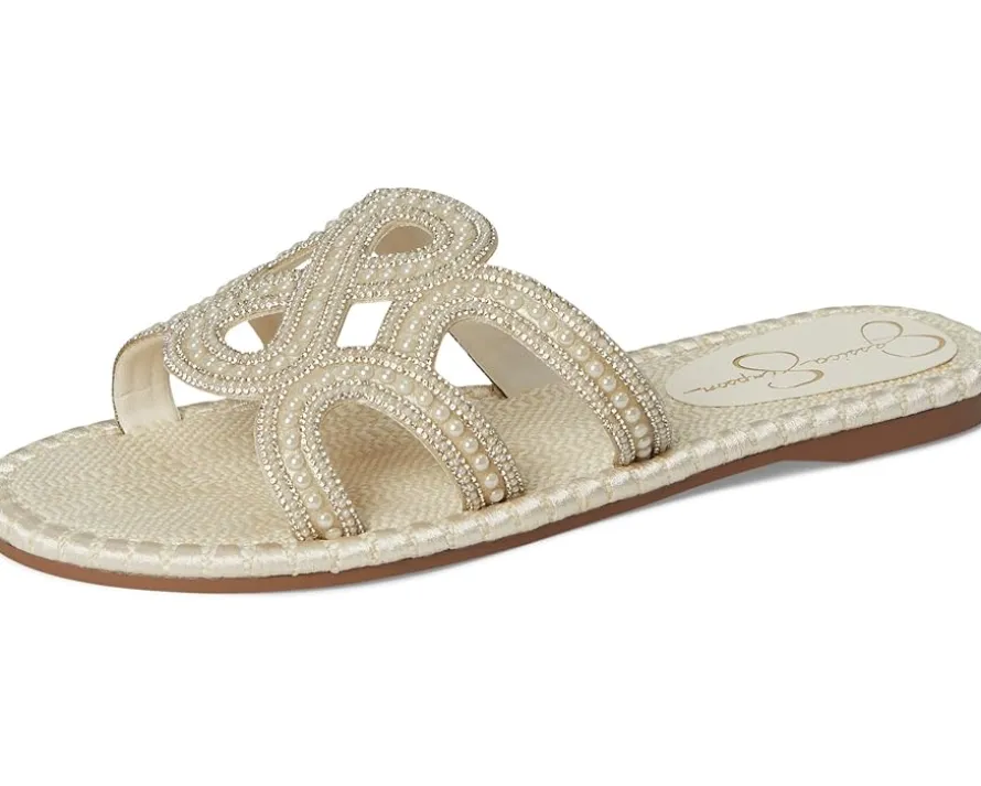 - The Jessica Simpson™ Bria Flat Woven Sandals are your go-to glam essential for warm-weather vibes and unforgettable nights. Featuring a luxe crystal-encrusted design on a breathable polyester upper, these slip-ons bring instant dazzle to casual jean shorts or dressy party looks. The comfy PU lining hugs your feet, while the cork insole offers lightweight cushioning for lasting wear. Finished with a durable rubber outsole and an open toe that lets your pedicure shine, the Bria Sandals are perfect for wedding dance floors, rooftop cocktails, or beachside strolls.