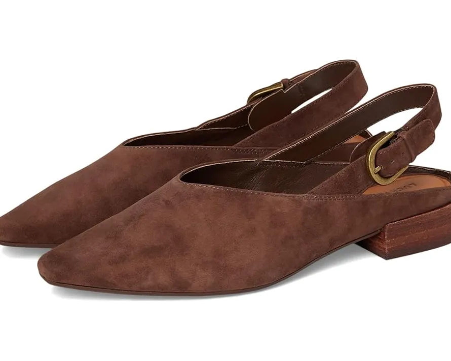 - The Lucky Brand® Brigeet Slingback Mule is designed with a sleek pointed toe and a low block heel. The adjustable buckle slingback strap ensures a secure, customized fit. The footwear is crafted with a suede upper and rubber outsole.