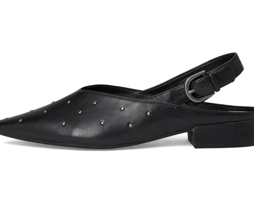 - The Lucky Brand® Brigeet Studded Slingback Mule is a sleek, low block-heel pump that blends edgy detailing with everyday versatility. Crafted with a faux leather upper, it features bold stud embellishments, a snip toe, and a slingback strap with an adjustable buckle closure for a secure, stylish fit. The faux leather lining and rubber outsole offer comfort and traction.