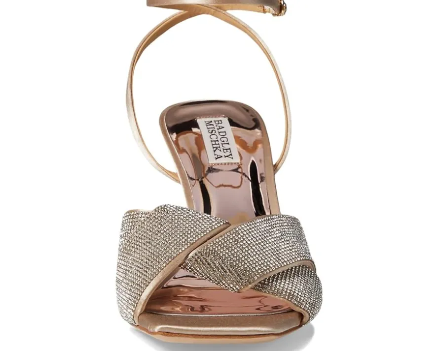 - Make a glamorous entry into any party or event wearing the Badgley Mischka® Brinlee heels. The silk upper of these sandals features rhinestone detailing for an eye-catching appeal. These heeled sandals come with a foam insole and breathable leather lining that makes them comfortable to wear for long hours. From your cocktail dresses to chic gowns, these leather heels add an eye-catching twist to your outfits and styles.
