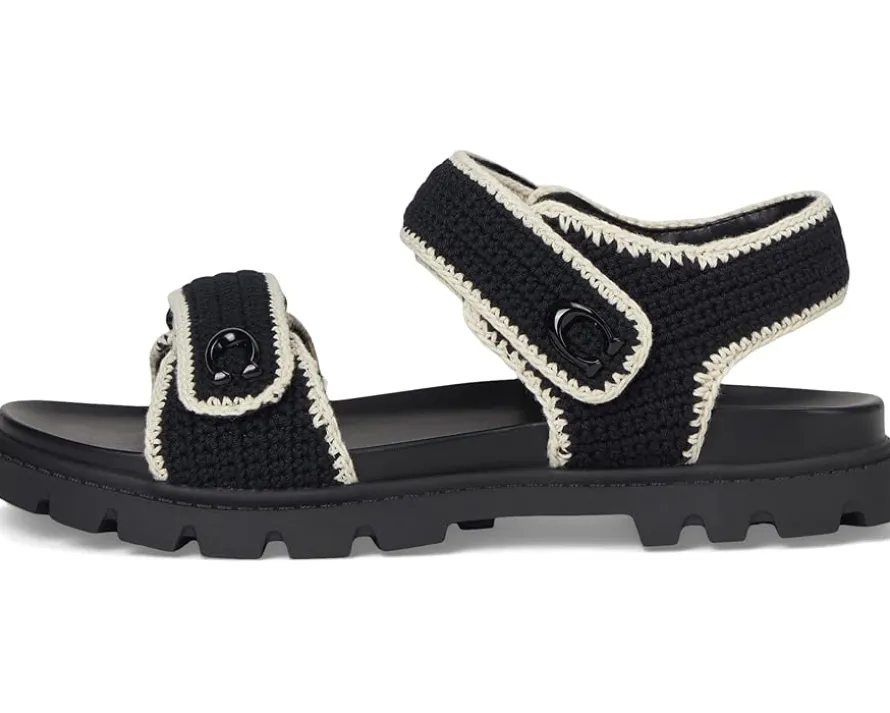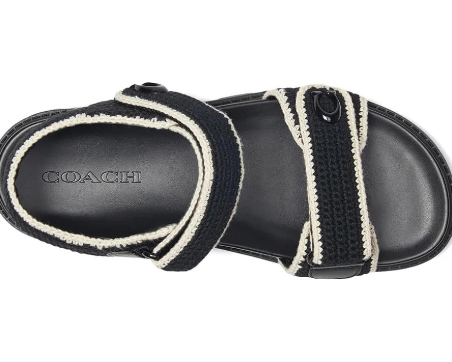 - Comfort and functionality blend together in the COACH® Brynn Crochet Sandals. Crafted with a crochet upper, man-made leather lining, and man-made leather footbed, these open round-toe sandals offer enhanced comfort with every step you take. The double hook-and-loop closure and backstrap ensure a secure fit.