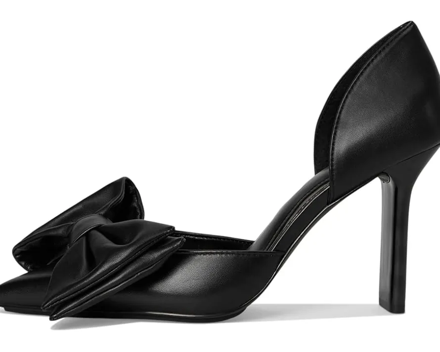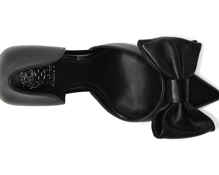 - The Vince Camuto® Burke Bow Detail Dress Pump, an elegant two-piece high heel pump, has a tonal blade heel. An oversized leather bow adorns the front of the dress pump, which features a padded footbed and rubber blend outsole. Crafted from leather upper, polyester lining, and rubber insole, this pair of sandals features pointed toe, slip-on style, and brand name on the footbed.