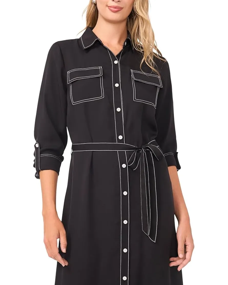 - Chic, effortless, and endlessly versatile: The Vince Camuto® Button-Up Shirt Dress with Contrast Stitching is your new go-to for polished style with a modern edge. Designed with a collared neck and button front closure, it offers timeless structure while the long sleeves with cuffs add a tailored finish. The below-the-knee silhouette makes it perfect for everything from workdays to weekend outings, while the tie closure at the waist cinches your shape for a flattering fit. Thoughtfully crafted with two chest flap button pockets, it balances function and fashion in one sleek package. The contrast stitching detail elevates the classic shirt dress design, giving it a touch of contemporary flair.