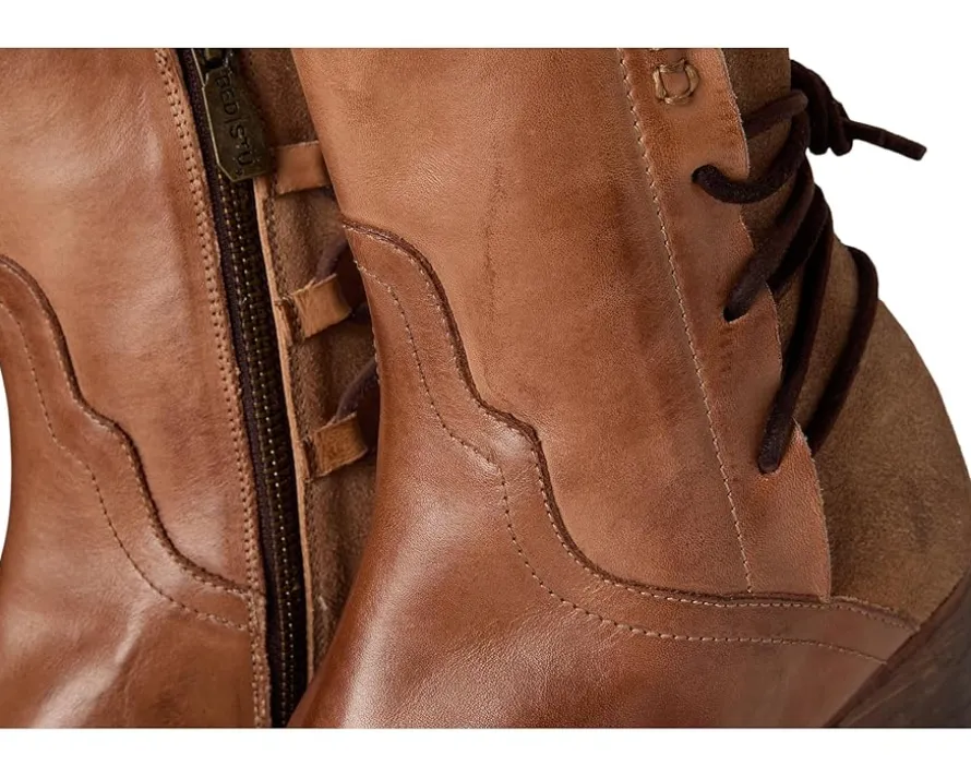 - The Bed Stu® Cable mid-ankle lace-up boot blends rustic charm with modern edge. Crafted from vegetable-tanned leather upper, it features a Western-inspired almond toe, scalloped edge detailing, and a rear lace-up accent for added character. A functional side zipper ensures easy wear, while the stacked block heel and durable rubber outsole provide comfort and stability.