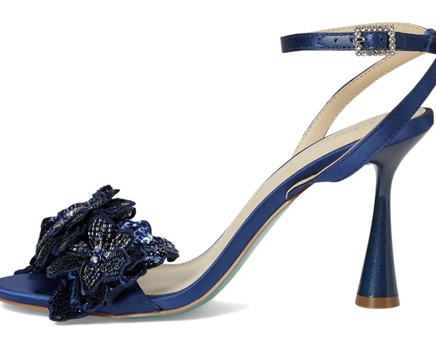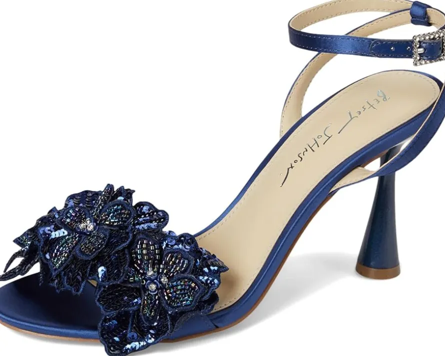 - Step out in floral fashion with the Blue™ by Betsey Johnson Cali sandals. The unique silhouette offers a timeless, stylish look with fun floral appliques. These heeled sandals are made of a rubber insole and polyester lining. The polyurethane upper features floral details and an adjustable ankle strap. From the office to the dance floor, you’ll have a look that’s sure to blossom wearing these floral sandals.
