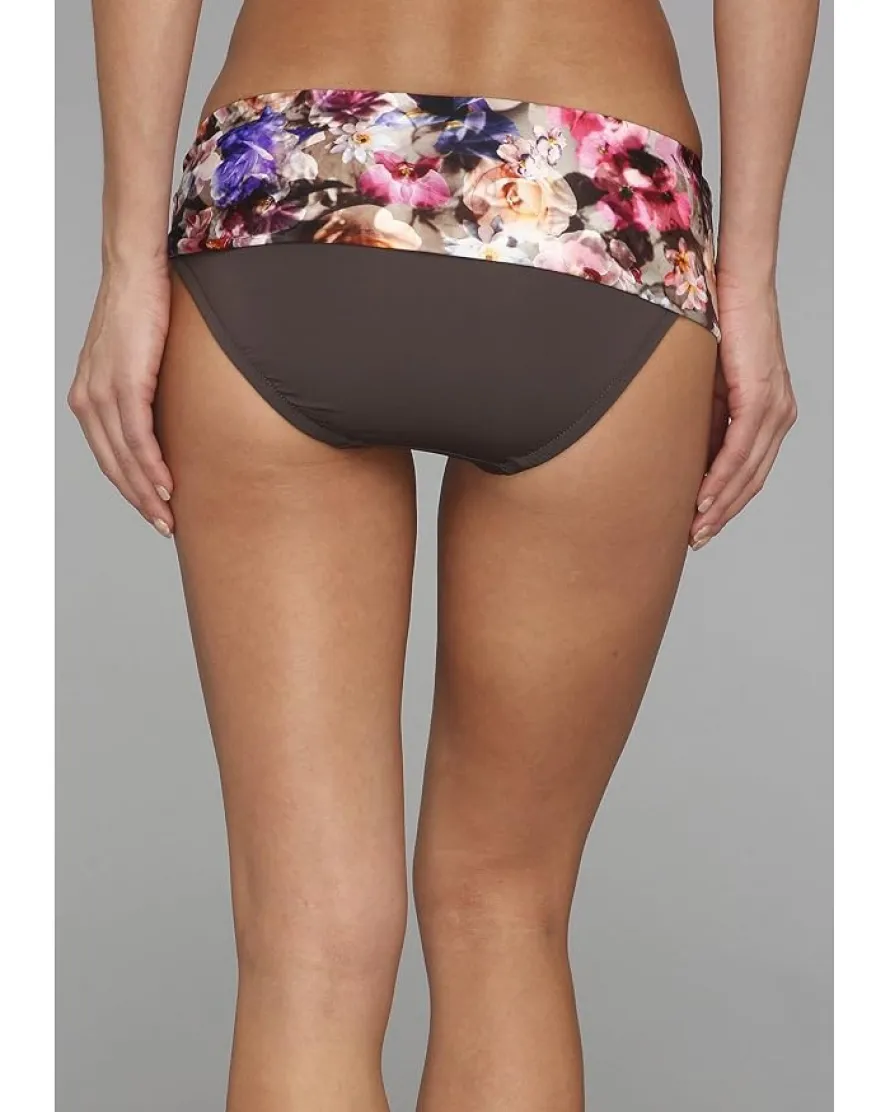 - Wide, foldover waistband with a shirred side flatters your figure and allows adjustable coverage.