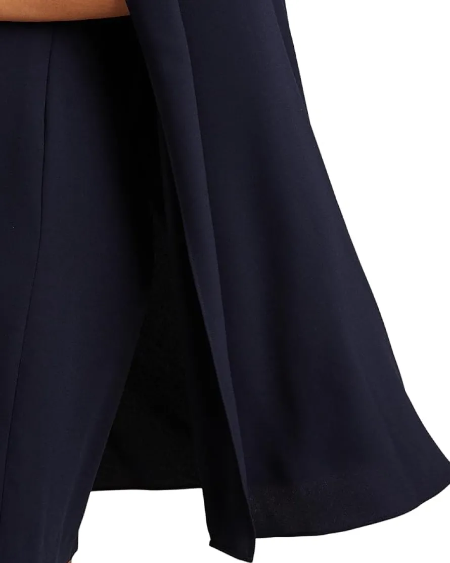 - A stylish choice for special occasions, this modern georgette cocktail dress is elevated by a cascading cape, which adds fluid movement to its body-hugging silhouette. Featuring a rounded neckline with a concealed left-side-seam zipper with a hook-and-eye closure that is intended to hit at the knee.