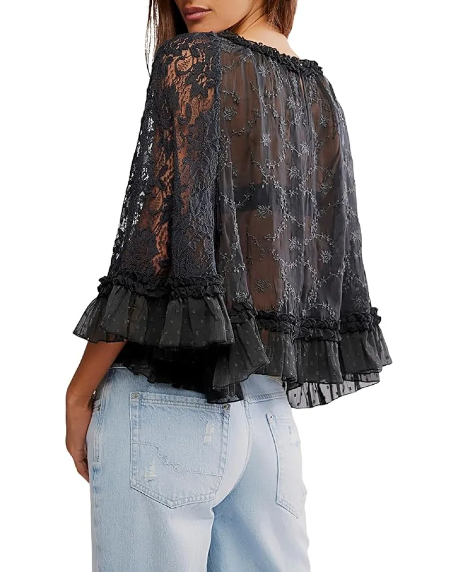 - Float into fashion donning the Free People™ Carly Cape Top. Darling as ever, this all-lace stunner redefines romantic charm with its breezy cape silhouette that turns every twirl into a moment. Crafted from delicate lace for that ethereal, feminine feel, it features a flattering, flowy fit that drapes effortlessly over the body. The crew neckline adds a touch of classic simplicity, while the ruffle trim brings the perfect amount of playful detail.