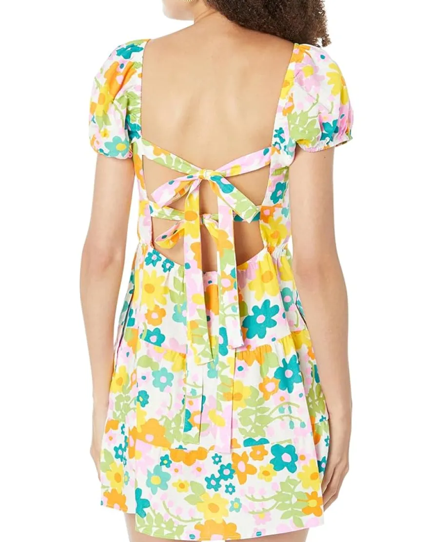 - A multicolored printed design adorns the look of the Show Me Your Mumu™ Cathy Mini Dress. The double tie closure on the back adds a classic appeal to your outfit and offers a glamorous look. Dress up or down wearing this fashionable silhouette and pair it with your favorite accessories to amp up your style.