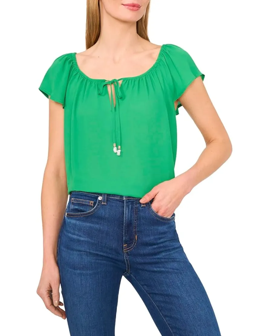- The CeCe™ Center Front Tie Round Neckline Flutter Sleeve Top combines a soft, feminine charm with effortless sophistication. Its lightweight, flowing short sleeves and tie-neck detail add breezy elegance to your silhouette.