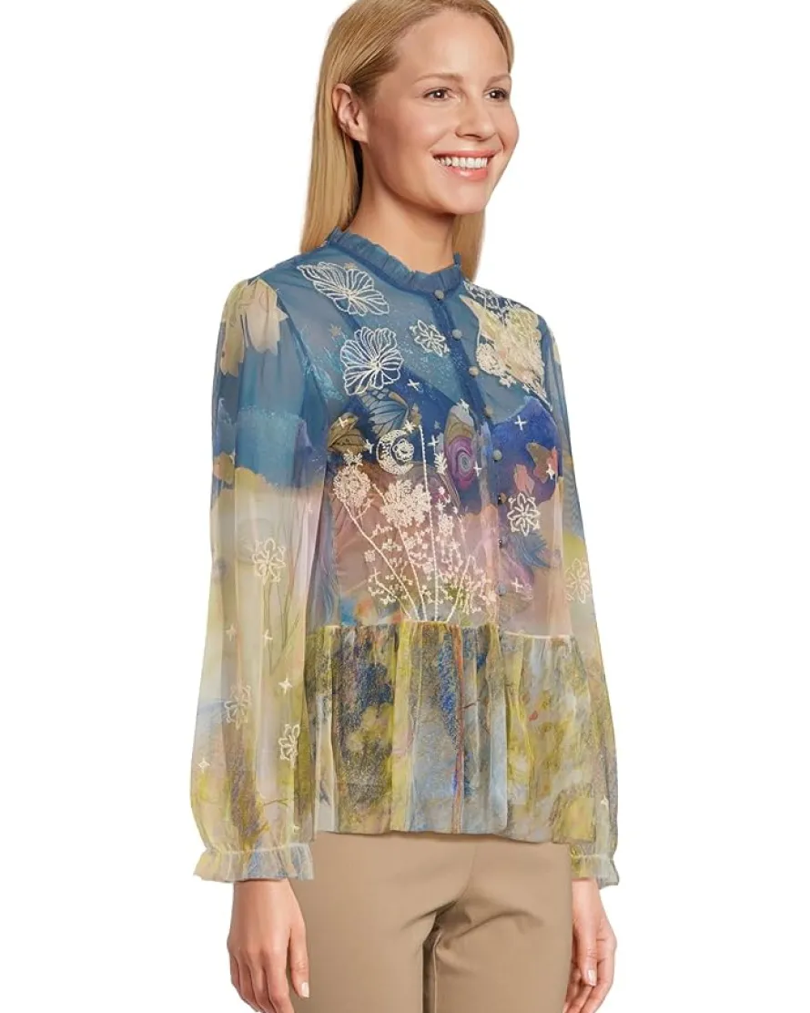 - Boho-chic vibes meet effortless elegance in the Johnny Was® Charlot Mesh Blouse (with slip), a dreamy piece designed to turn everyday dressing into an art form. Crafted with a lightweight mesh overlay and a slip for easy wear, this blouse captures attention with its vibrant printed design that feels both timeless and on-trend. The round neckline with button-front closure adds a delicate touch, while the long sleeves with elasticized cuffs bring in a hint of romantic flair. A charming ruffled hem completes the look, creating graceful movement with every step. Designed as a pull-on style, it offers convenience without compromising sophistication, making it a perfect blend of comfort and style.
