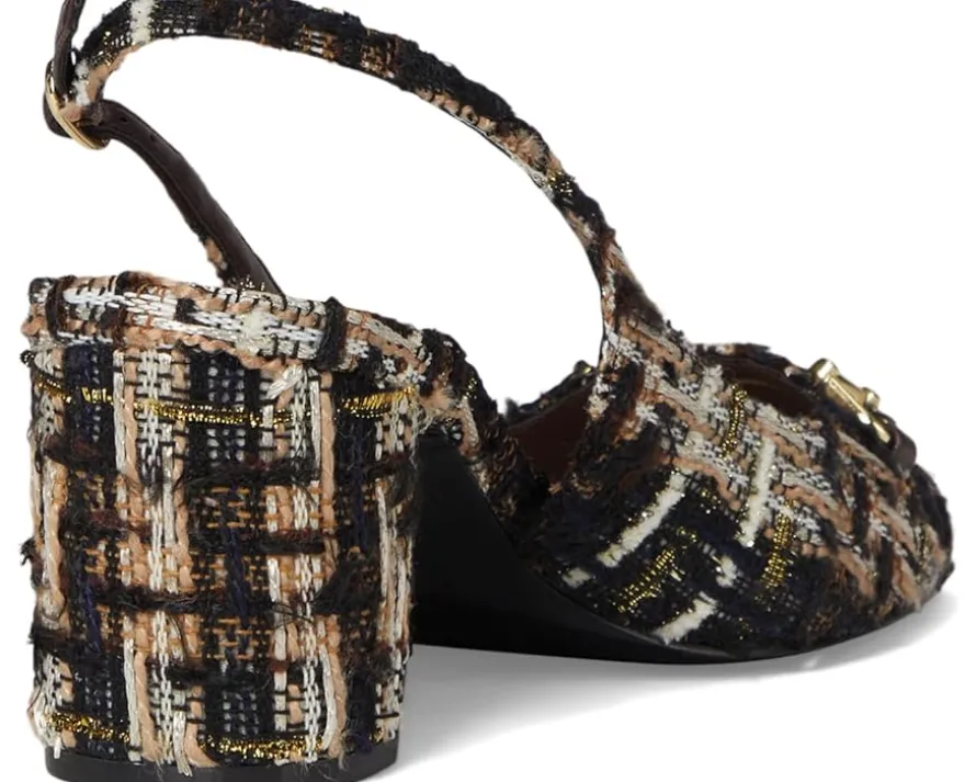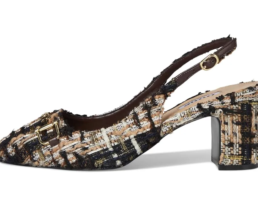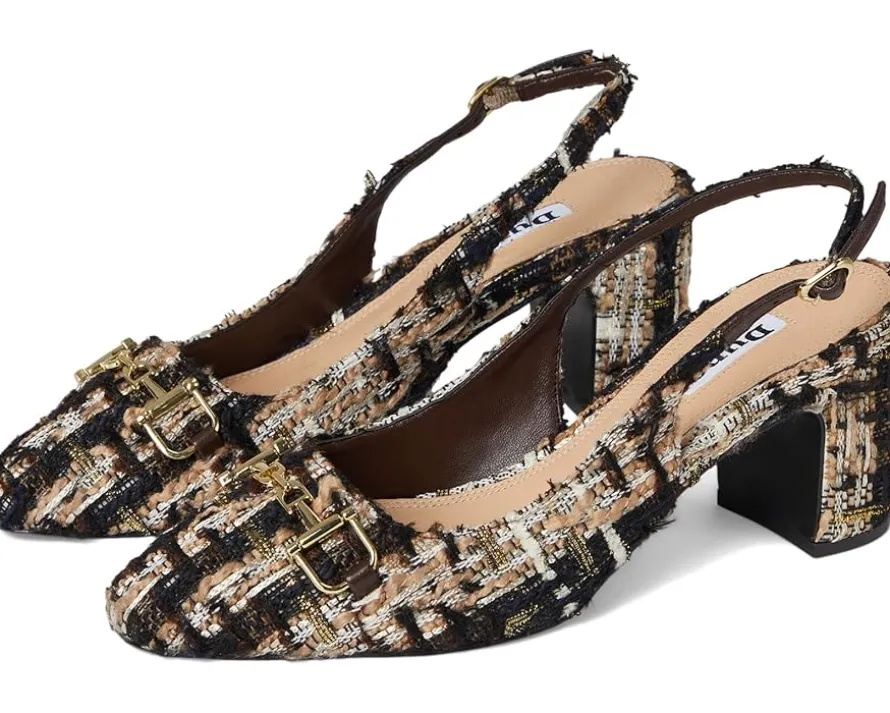 - Bring an instant dose of polish and sophistication to your attire donning the Dune London™ Choiced Dress Heels. Timeless and effortlessly comfortable, these shoes feature a textured fabric upper with an almond toe and a sleek metallic branded snaffle trim detailing at the vamp. Elevated by a sturdy block heel and secured with an adjustable buckle on the slingback strap, the footwear equally parts style and comfort.