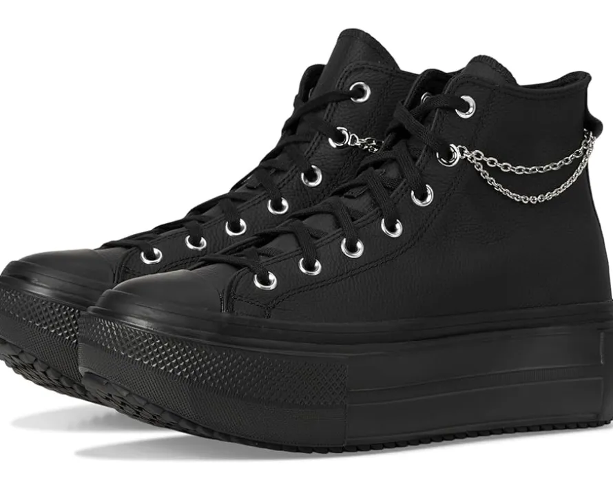 - Converse® Chuck Taylor All Star® Lift Double Stack Platform Chains: Lean into your punk rebellion with extra-tall leather platforms and bold, mixed-weight chains. It features a luxe, full-grain leather upper, with that extra-elevated platform Chucks look and an attached mixed-weight chains that nod to punk styling.