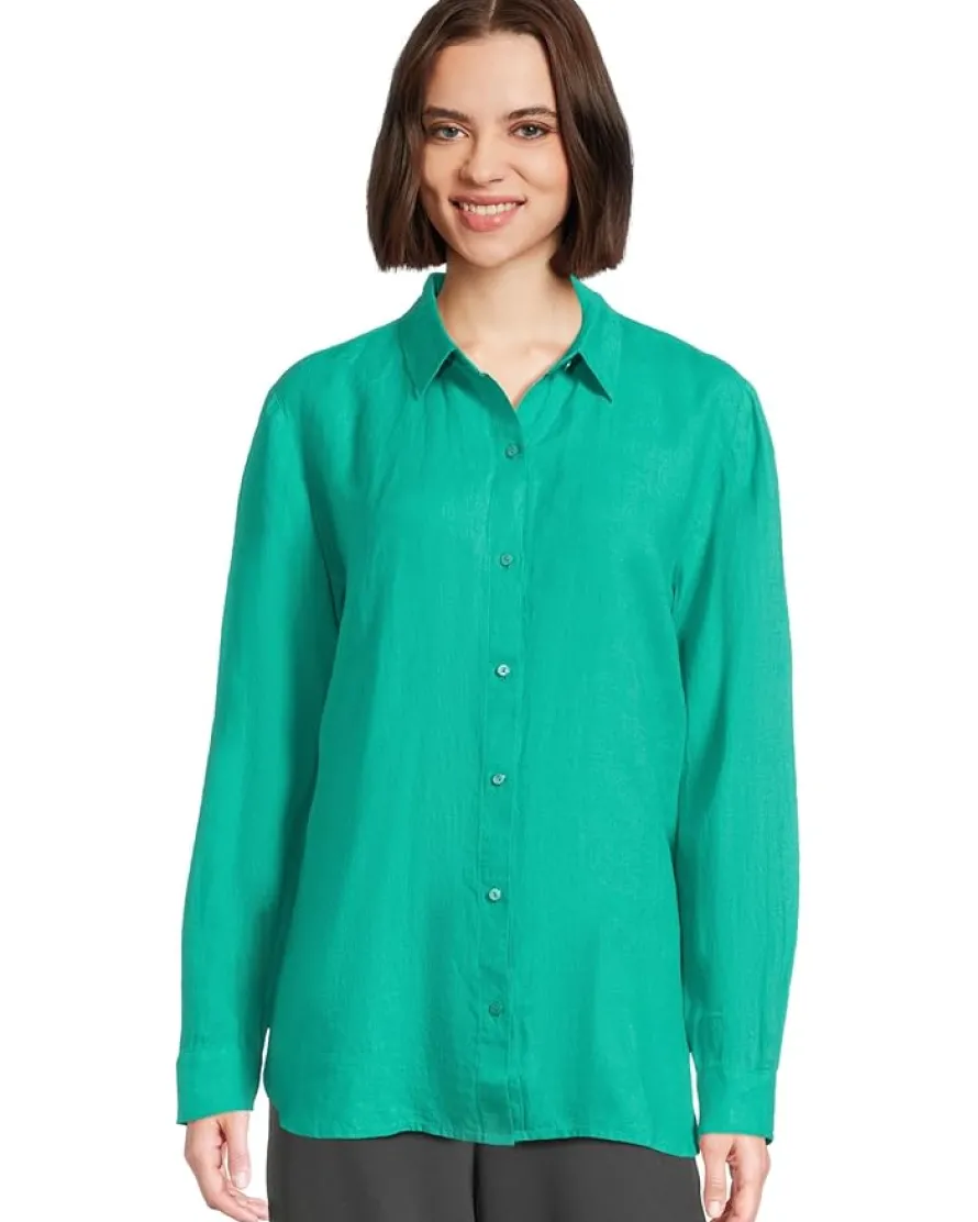 - Create a polished look with this light and airy EILEEN FISHER® Classic Collar Long Shirt. Featuring a fold-over collar, long sleeves with button closure cuffs, front button closure, and a shirttail hemline.