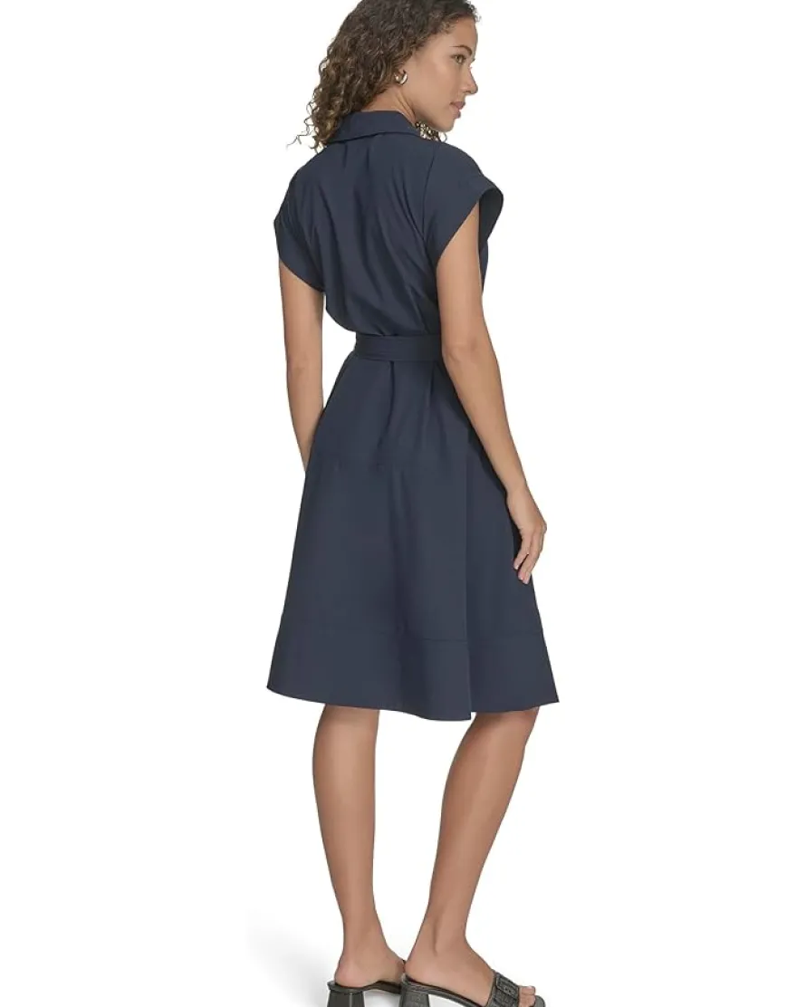 - Flaunt your refined taste in fashion by donning the Calvin Klein® Commuter Zip Front Aline Dress. The pull-on style dress features a collared neck with a quarter-zipper closure, cap sleeves, a belted detail at the waist, and a knee-length silhouette.