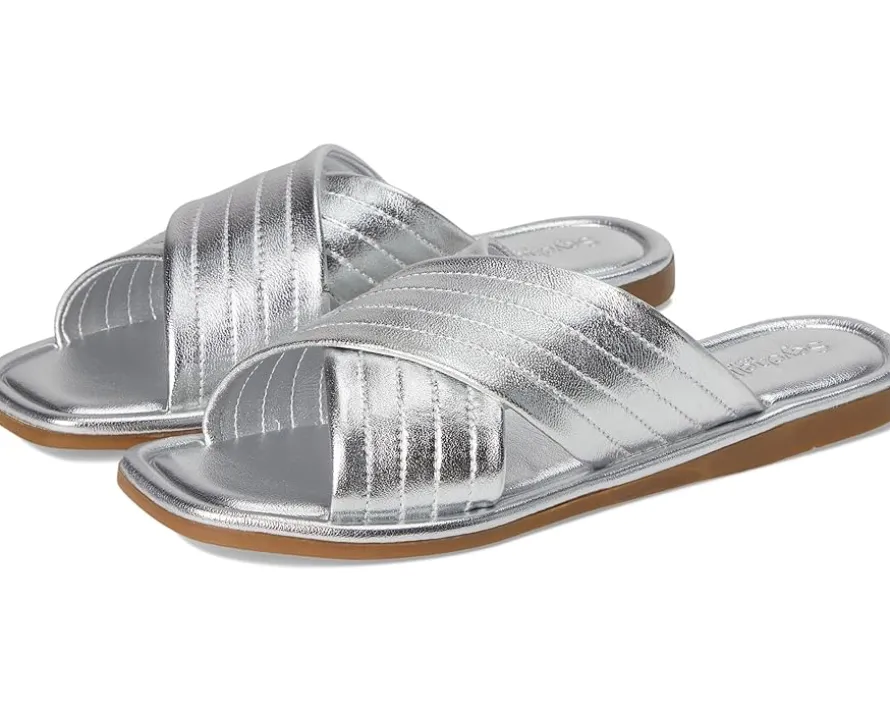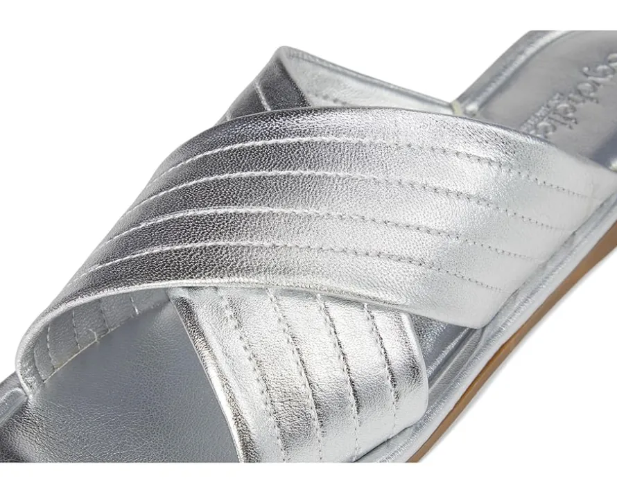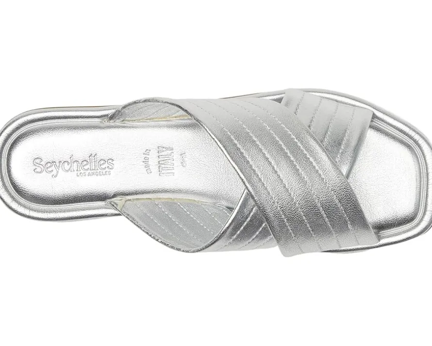 - Shimmer, slide, and shine-the courage sandal has arrived! Slip into effortless elegance wearing the Seychelles® Courage Metallic Leather Slide Sandal. Featuring a luxe leather upper that gleams in the light, these chic cross-band slides elevate any outfit with ease. The PU lining and faux leather insole provide a soft, cushioned feel, while the durable synthetic rubber outsole ensures a steady step. Designed for easy slip-on wear, they’re the go-to choice for seaside strolls, city escapades, or leisurely farmers’ market visits.