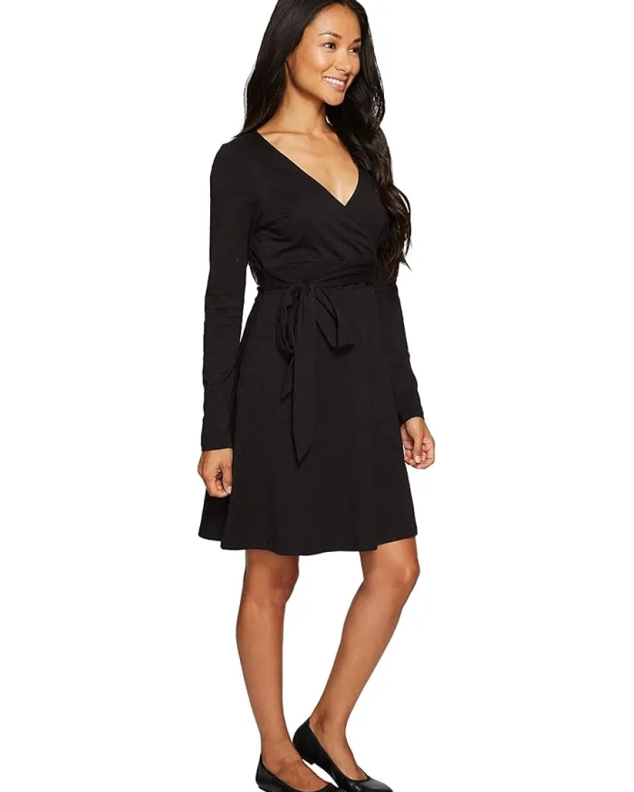 - The Cue Wrap Dress is your go-to dress this season! With easy, throw-on style and sublime softness, it steps easily from the everyday to your intercontinental treks.