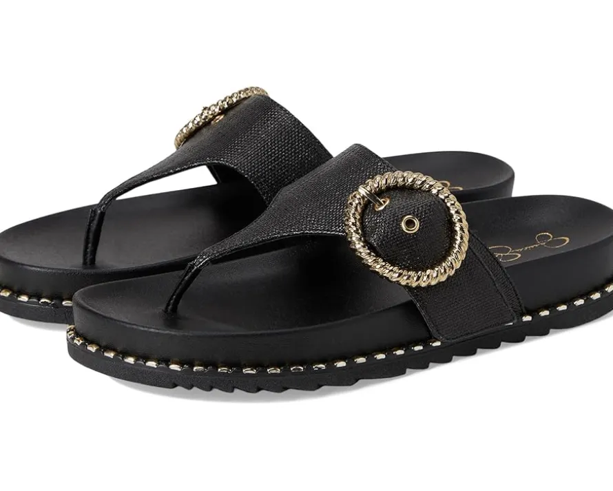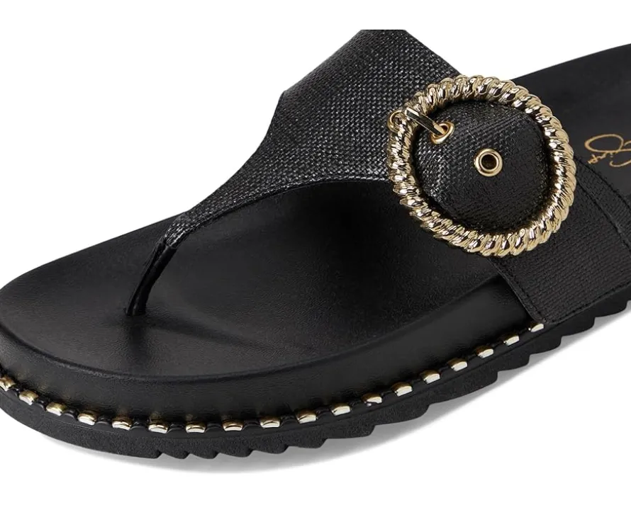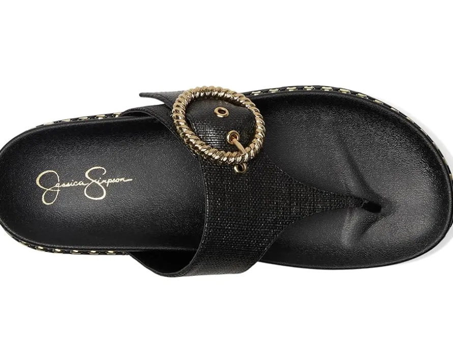 - The Cymmeri Buckle Sandals from Jessica Simpson™ featured a raffia thong style upper embellished with a textured buckle. Crafted from a jute upper, polyester lining, and insole. The sturdy outsole with subtle studded accents offers durability and traction. This sandal has style for days.