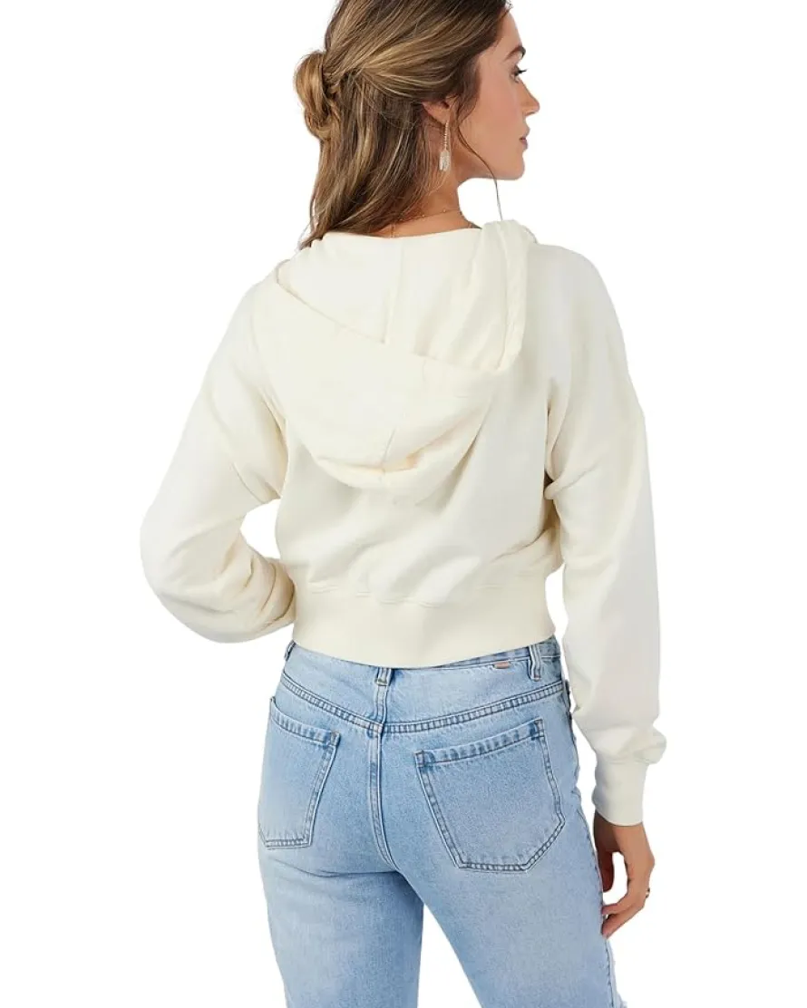 - Layer a stylish look with this fleece zip-up hooded O’Neill™ Darcie sweatshirt and feel cozy all day long. It features a printed art design on the right sleeve and kanga pockets.