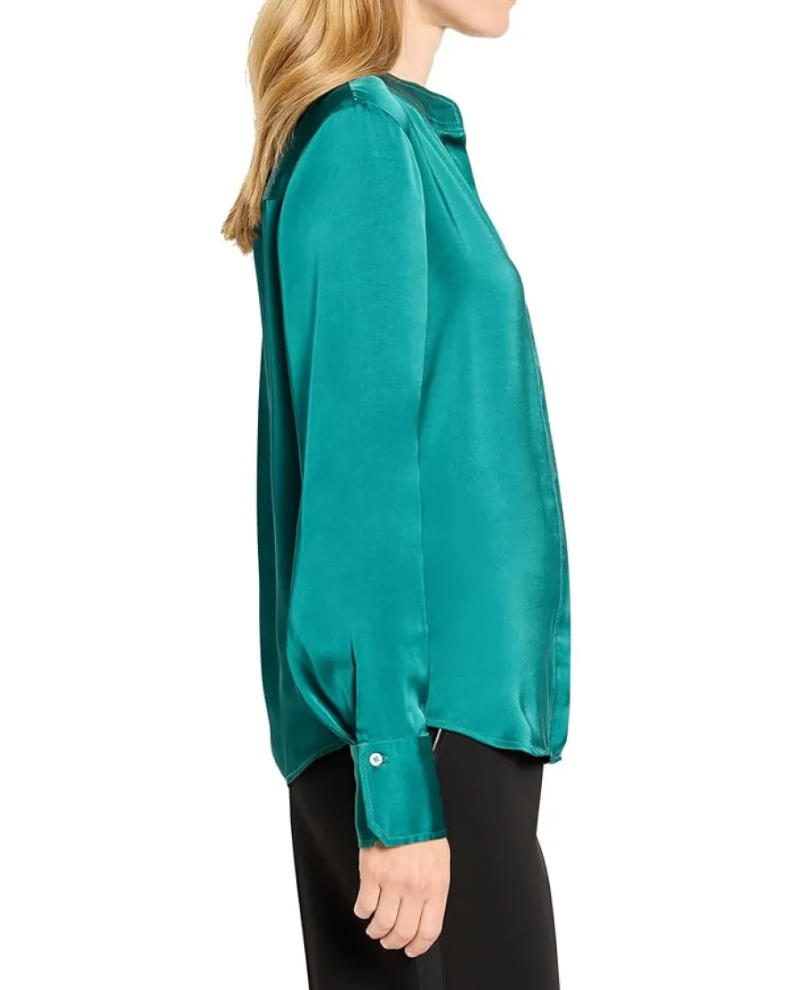 - An easy band collar top taken to the next level with anything-but-ordinary construction. Crafted from a luxe Day Gloss fabric, she offers the sophisticated look of silk with a more durable, easy-care design. With a hidden button front and cuff. The weight of the fabric provides a flattering drape, while the breezy woven construction ensures all-day comfort.