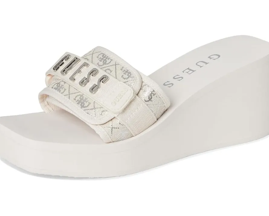 - Style that’s ahead of its time, GUESS® Dellean. Designed with a lightweight EVA upper and outsole, these wedges deliver a breezy, barely-there feel that’s perfect for warmer weather. The open square toe keeps your look modern and fresh, while the hook-and-loop single band strap offers a secure, customizable fit. Lined with synthetic rubber and set on a comfortable rubber insole, every step feels cushioned and confident. The signature Guess charm logo adds that unmistakable touch of glamour, ensuring your footwear makes a statement without saying a word.