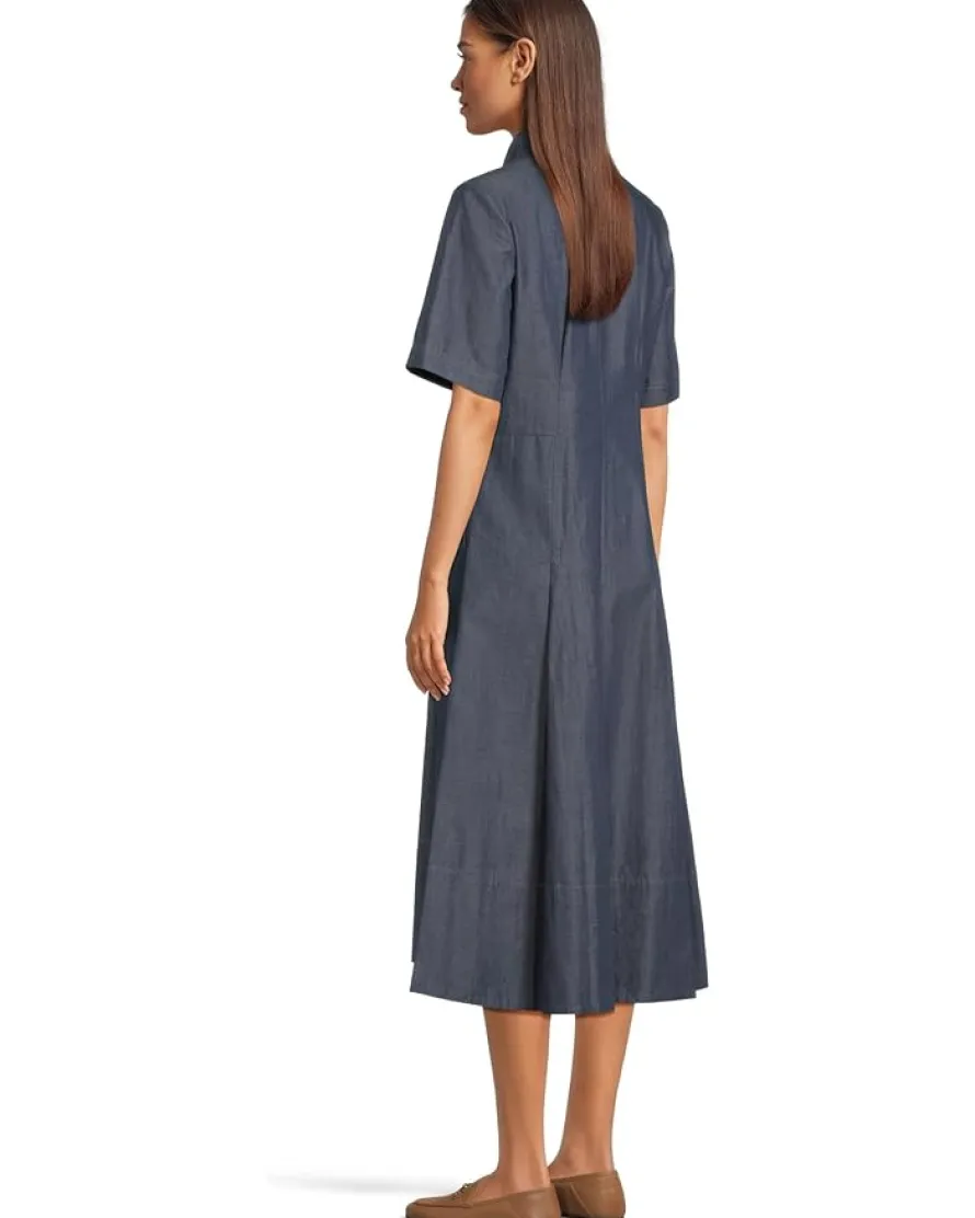 - Amaze everyone with your sleek and stylish aesthetic by donning the Vince® Denim Short Sleeve Shirt Dress. The full-pleated A-line dress features a collared neck, short sleeves, a hidden-button placket, two hand pockets, and a midi-length silhouette.