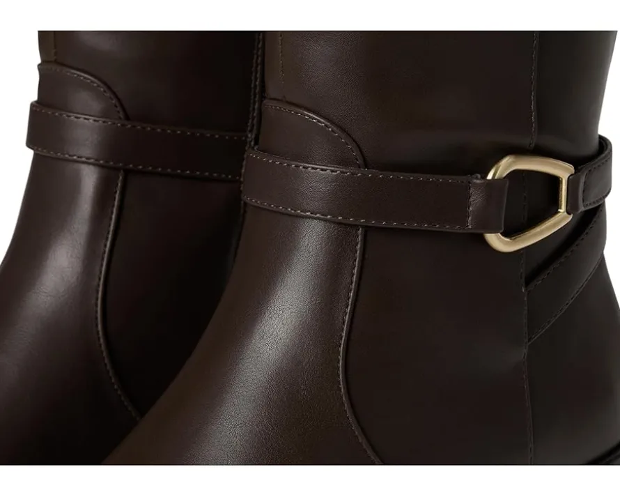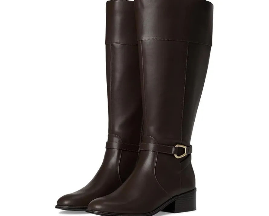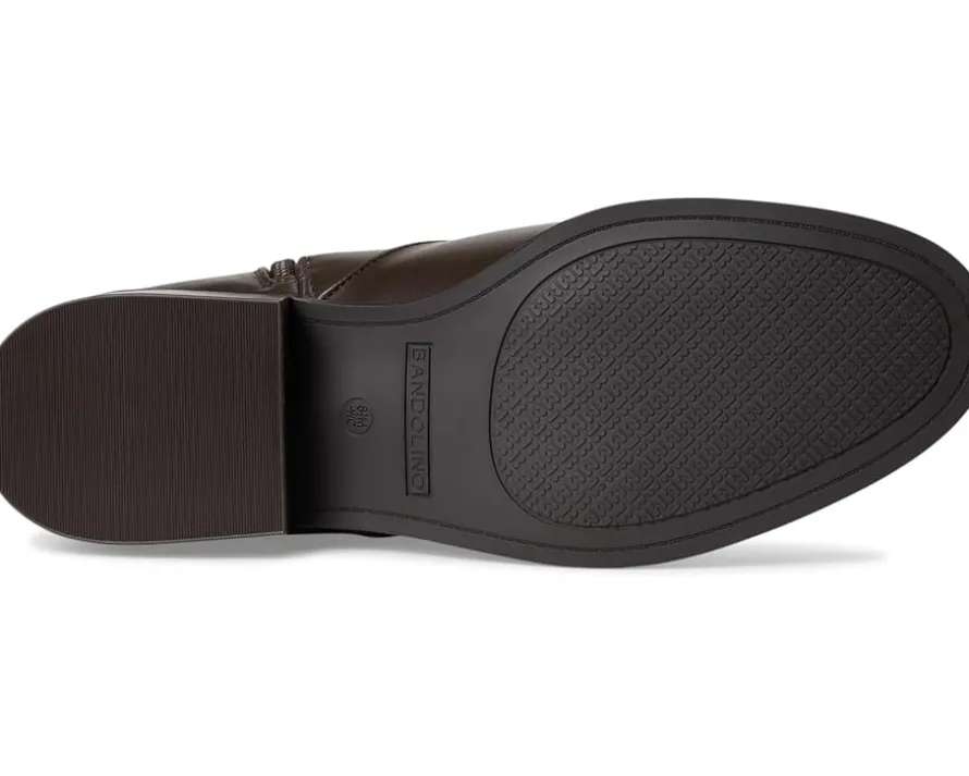 - Add a hint of charming flair to your ensemble wearing the Bandolino® Dennie riding boots. This knee-high footwear has eye-catching hardware at the sleek ankle strap and a cushioned footbed for all-day comfort. The synthetic upper is accompanied by a block heel and side zipper for easy entry.