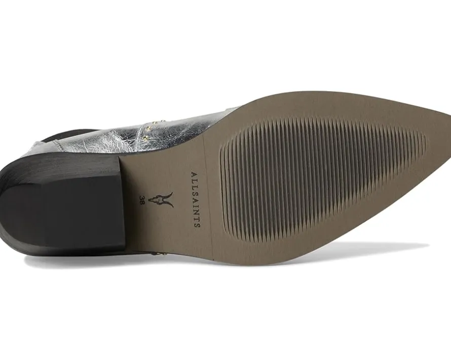 - Step into edgy sophistication wearing the AllSaints™ Denver Stud Boots-where bold style meets every day comfort. Crafted from premium leather with a durable synthetic rubber outsole, these knee-high boots exude confidence and timeless allure. The sleek block heel adds just the right amount of lift while offering stability for all-day wear. Featuring a pull-on design for easy slip-on convenience, these boots are perfect for any occasion, from casual to chic. With intricate stud detailing, the Denver Stud Boot makes a statement that’s both fierce and fashionable.