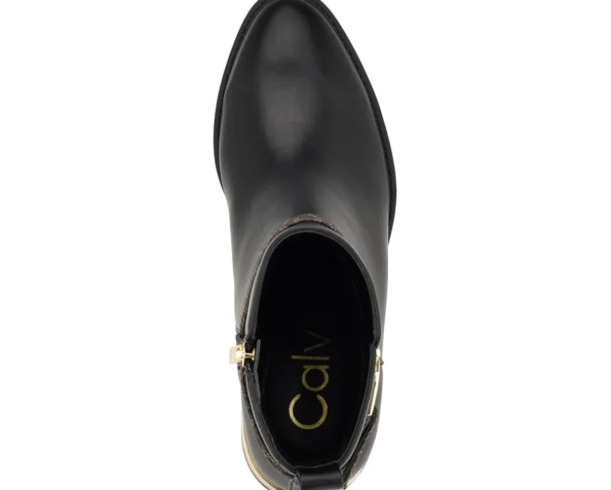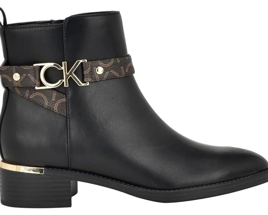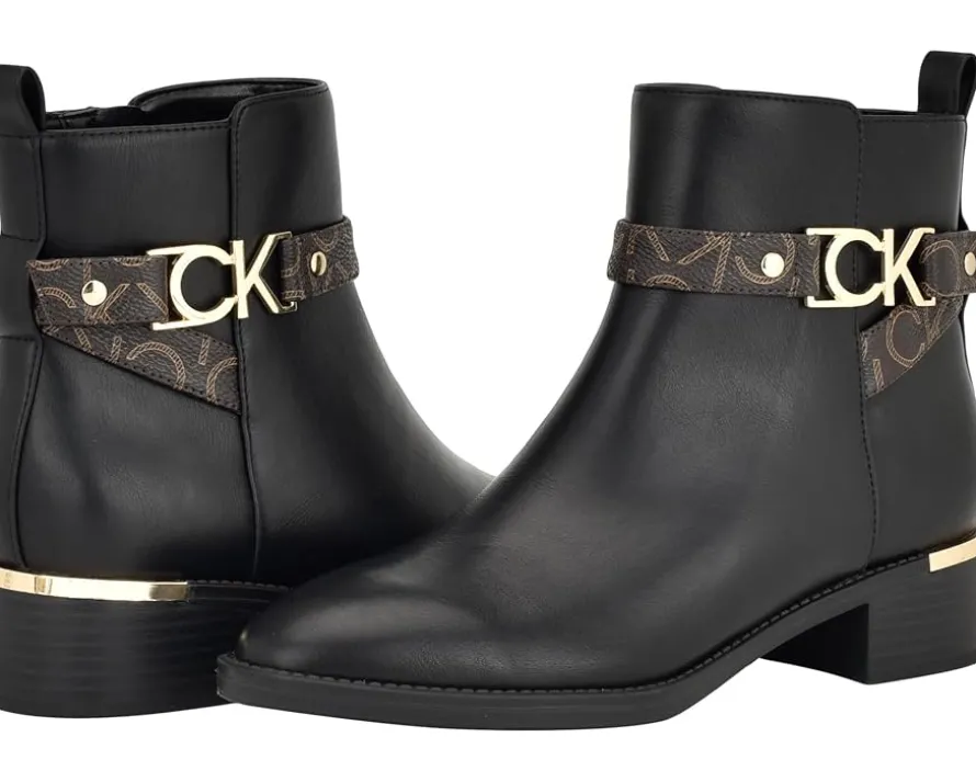 - Make life easier and impress everyone around you with a stylish look by wearing Calvin Klein® Dhara boots. The boots feature an almond toe and zipper closure. It is crafted from patent faux leather upper, textile/man-made lining, and comfortable insole.