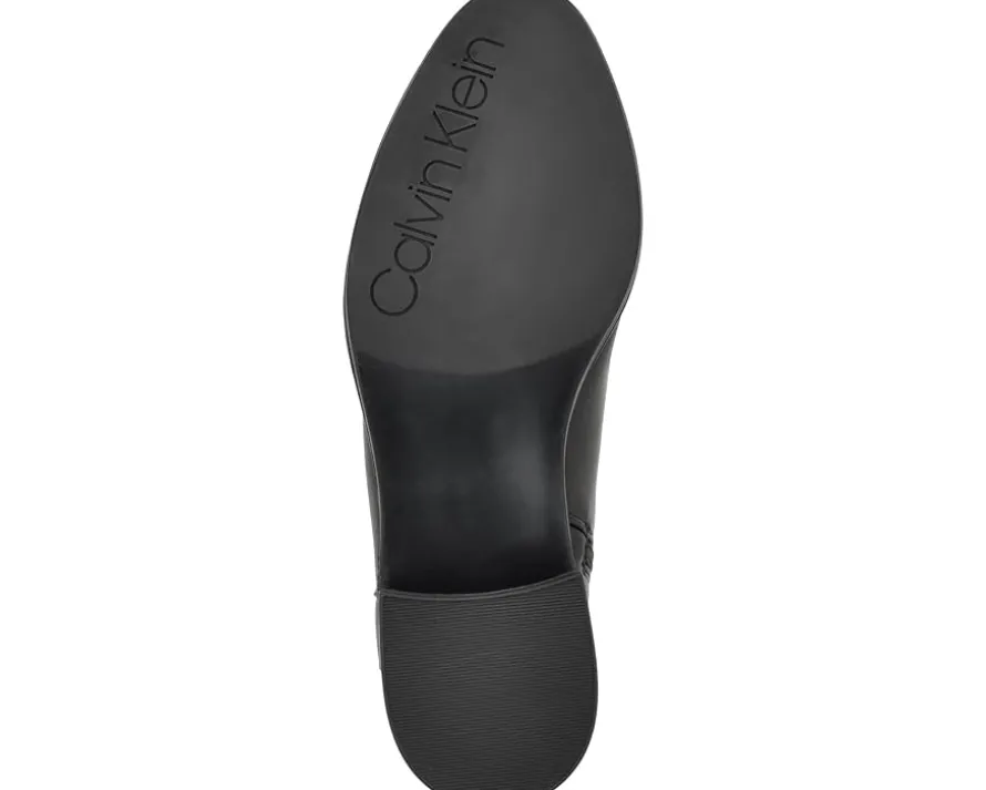- Calf-high boots with heel pull-on tabs, block heel, and CK logo detailing around the ankle.