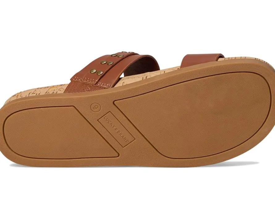 - The Lucky Brand® Dineesa Studded Two Band Flat Sandals are a stylish and edgy addition to your footwear collection. Featuring polished studs and double-band straps, these slip-on sandals bring a modern attitude to your warm-weather looks. Designed with a cushioned footbed, they offer comfort for all-day wear.