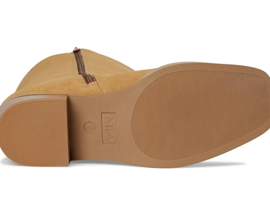 - MIA™ Duston-F takes rustic-chic to a new level. This tall boot is crafted from vegan suede upper, includes pull tabs and a zippered side closure for easy wear, and features a knee-high shaft that pairs perfectly with your favorite denim skirt. Finished on a block heel and the MIA Signature Footbed™-made for the girl on the go.