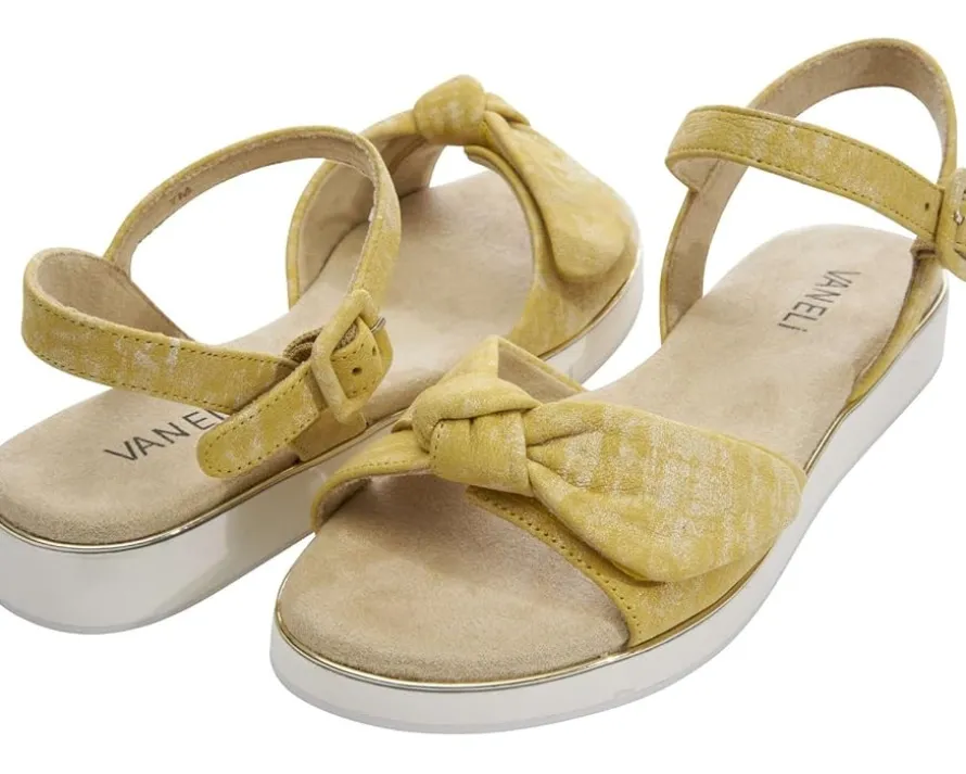 - Let your feet feel lightweight as you take a step ahead by wearing the Vaneli® Earla. The slip-on style flats have a leather upper, lining, and faux leather insole that adds to the longevity and prolonged wearing. The flats have an open round-toe design, ankle support strap, side buckle closure, and knotted detailing on the upper vamp.