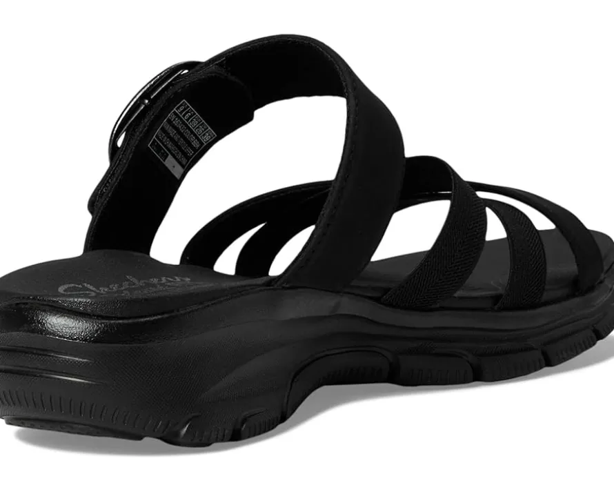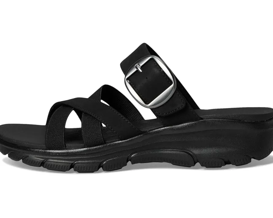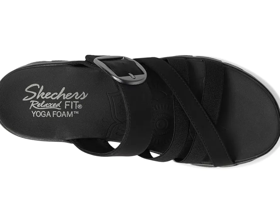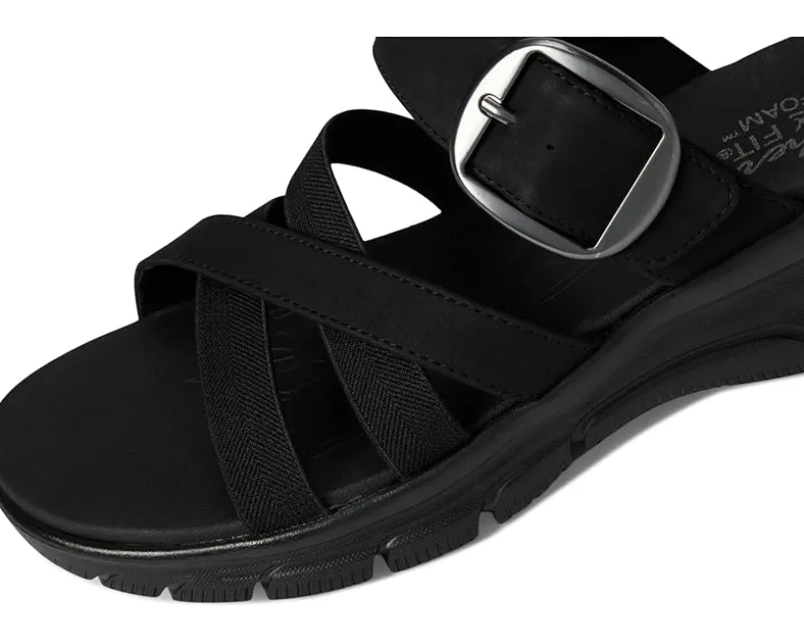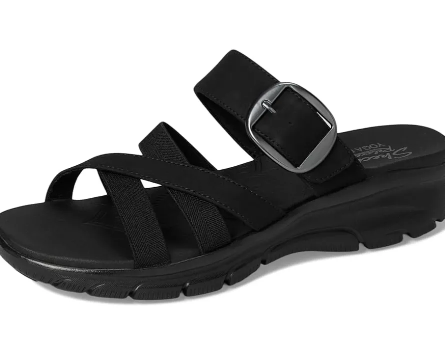 - Head on for explorations in boundless comfort wearing the water-resistant SKECHERS® Easy Going – Perfect Company Sandals. Crafted with vegan materials, the slip-on slides are designed with a double-band knit leather upper, leather lining, and a Yoga Foam® cushioned comfort footbed. The adjustable buckle closure ensures a custom fit.