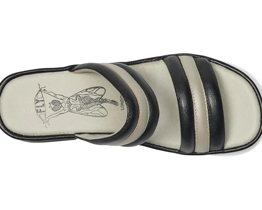 - The stitch-down construction of the FLY LONDON® EITY580FLY sandals allows for great flexibility. These heeled sandals are made of a foam insole and polyester lining. The soft leather upper is beautiful and the heel-to-toe padded insole, rounded toe shape, and flexible rubber outsole add comfort to your feet.