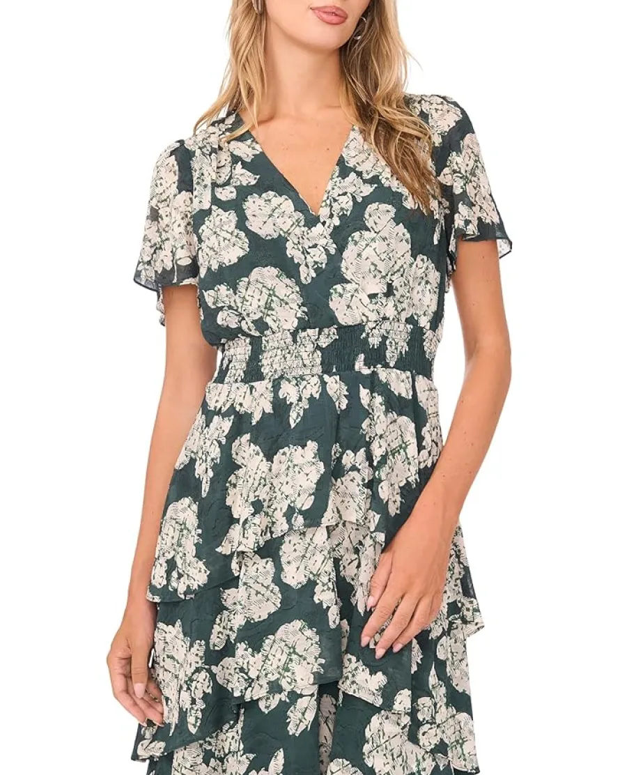 - The Vince Camuto® Elbow Sleeve Smocked Waist Tiered Maxi Dress is a graceful, fit-and-flare silhouette designed to flatter with ease and elegance. Featuring short sleeves and a smocked waist, this dress offers a comfortable, cinched fit that enhances the natural waistline. The tiered skirt adds soft volume, while the floral print allover creates a striking flair.