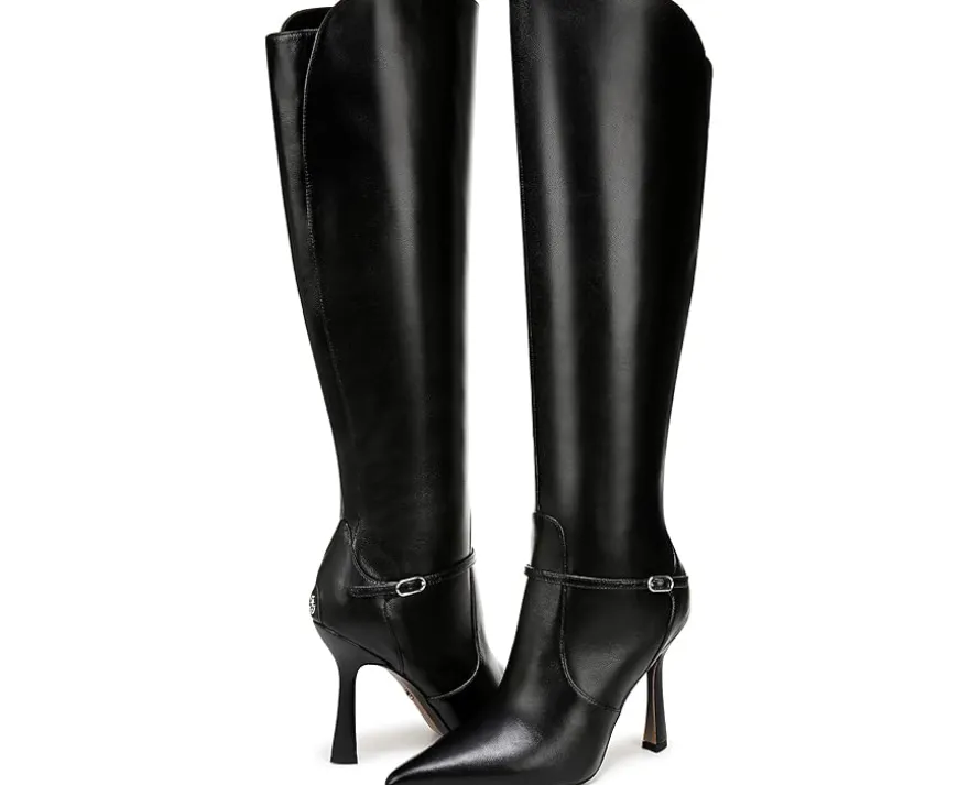 - Feel sky-high wearing the Sam Edelman® Elia boots with belt detailing and tapered stiletto heels. The leather upper of these boots features fall textures and chunky knits for a sleek look. These tall boots are crafted with a polyurethane insole and lining for all-day comfort. These above-the-knee heeled boots add a glamorous look to your outfits and styles.