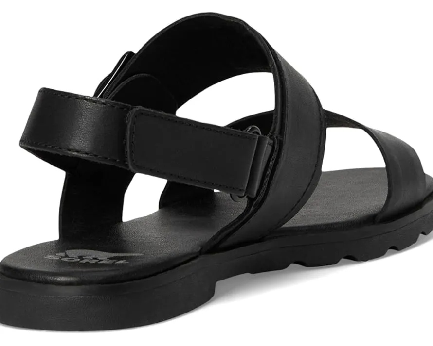 - Innovate your style this season wearing the super comfortable SOREL® Ella™ III Slingback Flat Sandals. This round toe pair features full-grain leather upper construction with hook-and-loop ankle strap closure.
