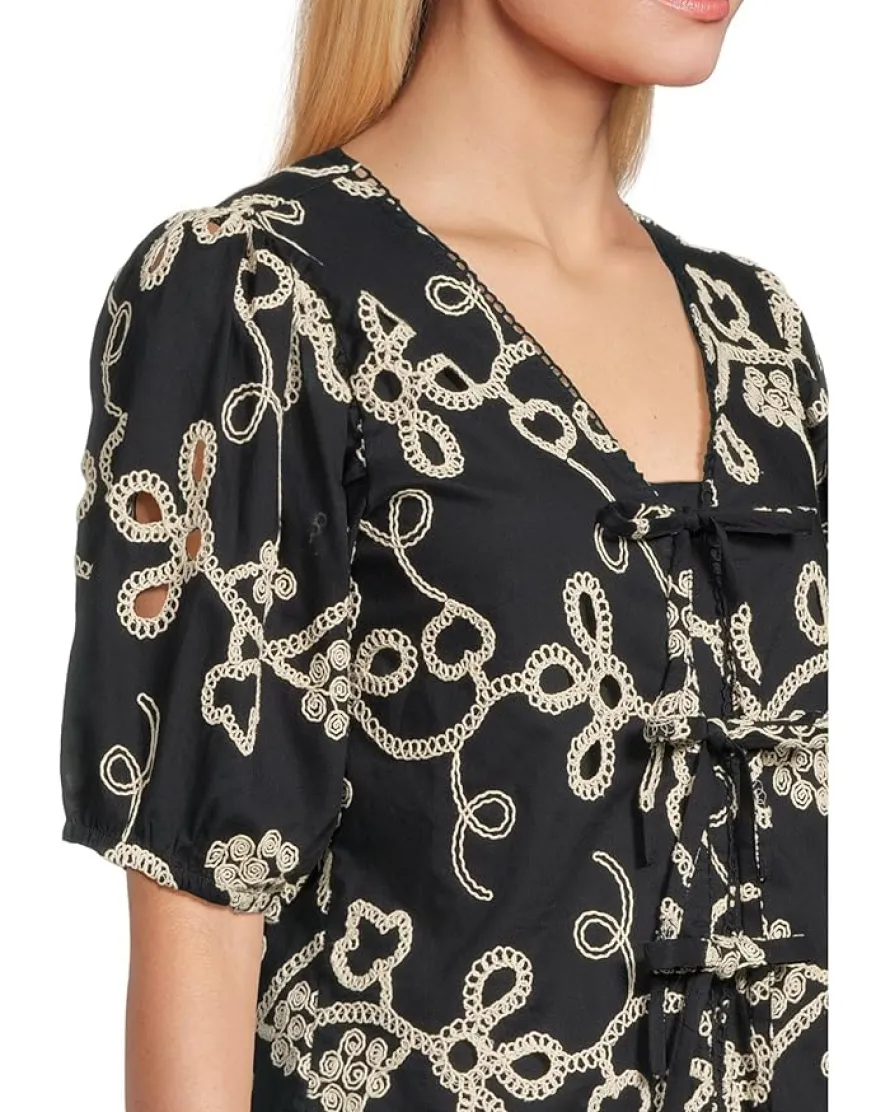 - Add a dash of style to your casual wardrobe with the CeCe™ Embrodiery Short Sleeve Open Tie Front Top. This breezy top with an open tie-front detail exudes casual elegance. It features a V-neckline, allover embroidered details, a scallop lace trim, and a straight hem. The short puff sleeves and lightweight fabric make it ideal for warm days, while the bow tie-front adds a playful touch to your outfit.