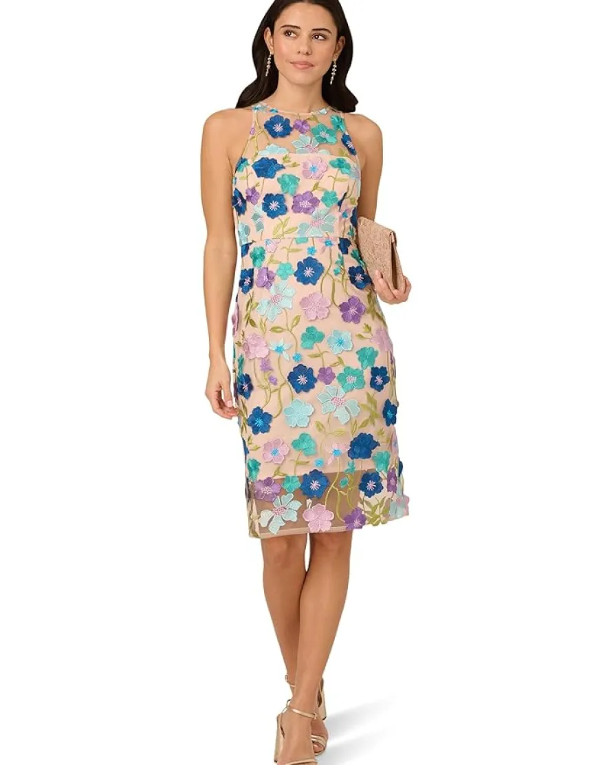 - Get ready for a fun party or casual date by wearing the Adrianna Papell® Embroidered Column Midi Dress. The lace detailing on the neckline and back gives it an eye-catching appeal. This printed dress is designed with a sleeveless style and a halter neckline. The zippered back closure of the dress offers easy wear while the slit at the back makes it easy to move around. Grab everyone’s attention at the party by wearing this embroidered dress.