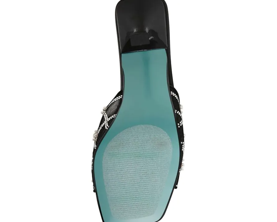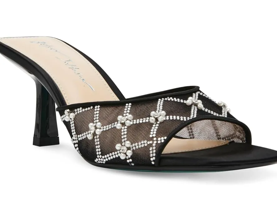 - Detailed in a diamond pattern, the rhinestone embellishments over the front strap perfectly accentuate the beauty of Blue™ by Betsey Johnson Emm Sandals. The pull-on footwear features breathable mesh upper construction with stiletto heels and squared toe silhouette.