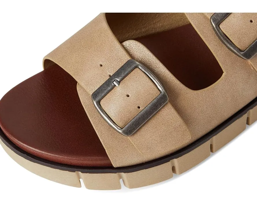 - Enjoy the ultimate comfort wearing the MIA™ Esei. Crafted from faux leather upper, lining, and insole, this pair of sandals features open round toe, suede and a sneaker bottom sole, signature brand detailing on the footbed, double buckle strap detailing, slip-on style, and contoured footbed.