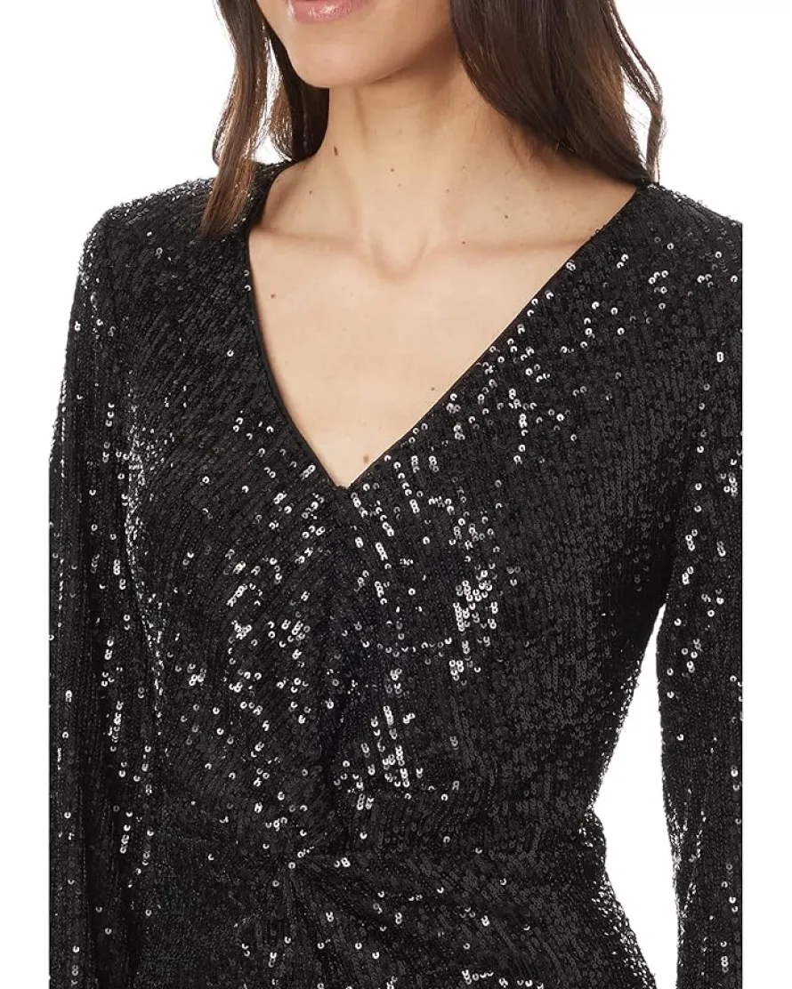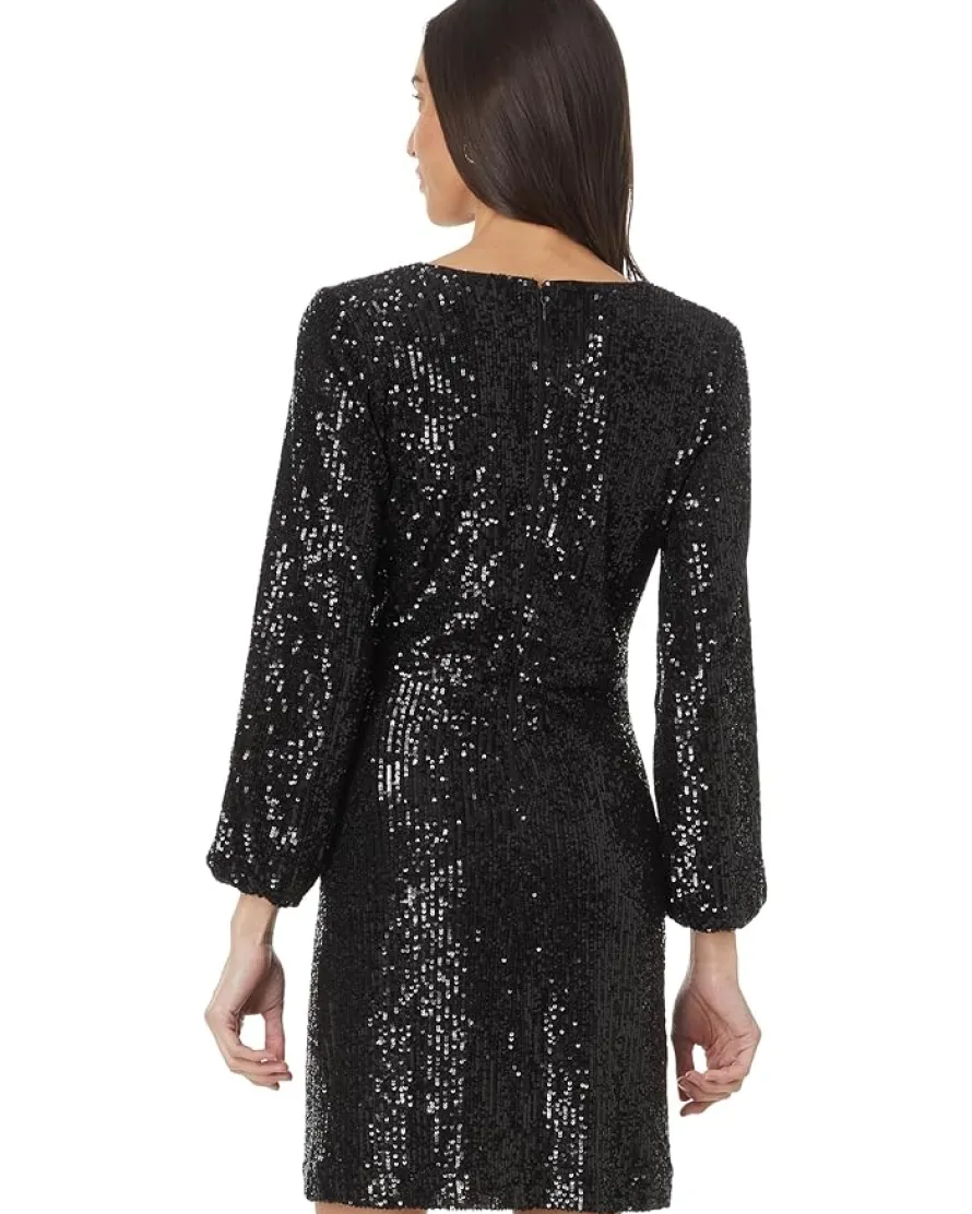 - Sparkle and shine in style adorning the Lilly Pulitzer® Estrella Sequin Dress! This stunning above-the-knee dress features a deep V-neckline and elegant long sleeves, perfect for any occasion. The straight fit silhouette flatters your figure, while the twist detail at the waist adds a touch of sophistication. With bracelet-length blouson bubble-hem sleeves, this pull-on dress combines comfort and glamor effortlessly.