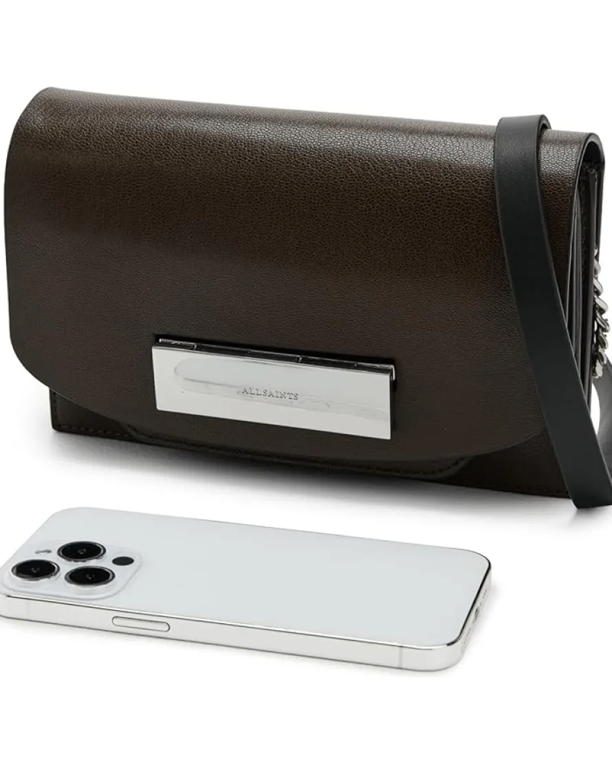 - Chic meets sleek, AllSaints™ Etta Clutch. Crafted from premium leather with a luxe leather lining, this statement piece features a new branded hinge push-lock closure that adds a modern twist to a timeless silhouette. It’s a roomy single compartment with an interior pocket that keeps your essentials secure and organized, phone, cards, keys, and more. Whether carried by hand for an ultra-minimalist vibe or worn with the removable chain strap for hands-free glam, it’s the kind of clutch that turns heads wherever you go.