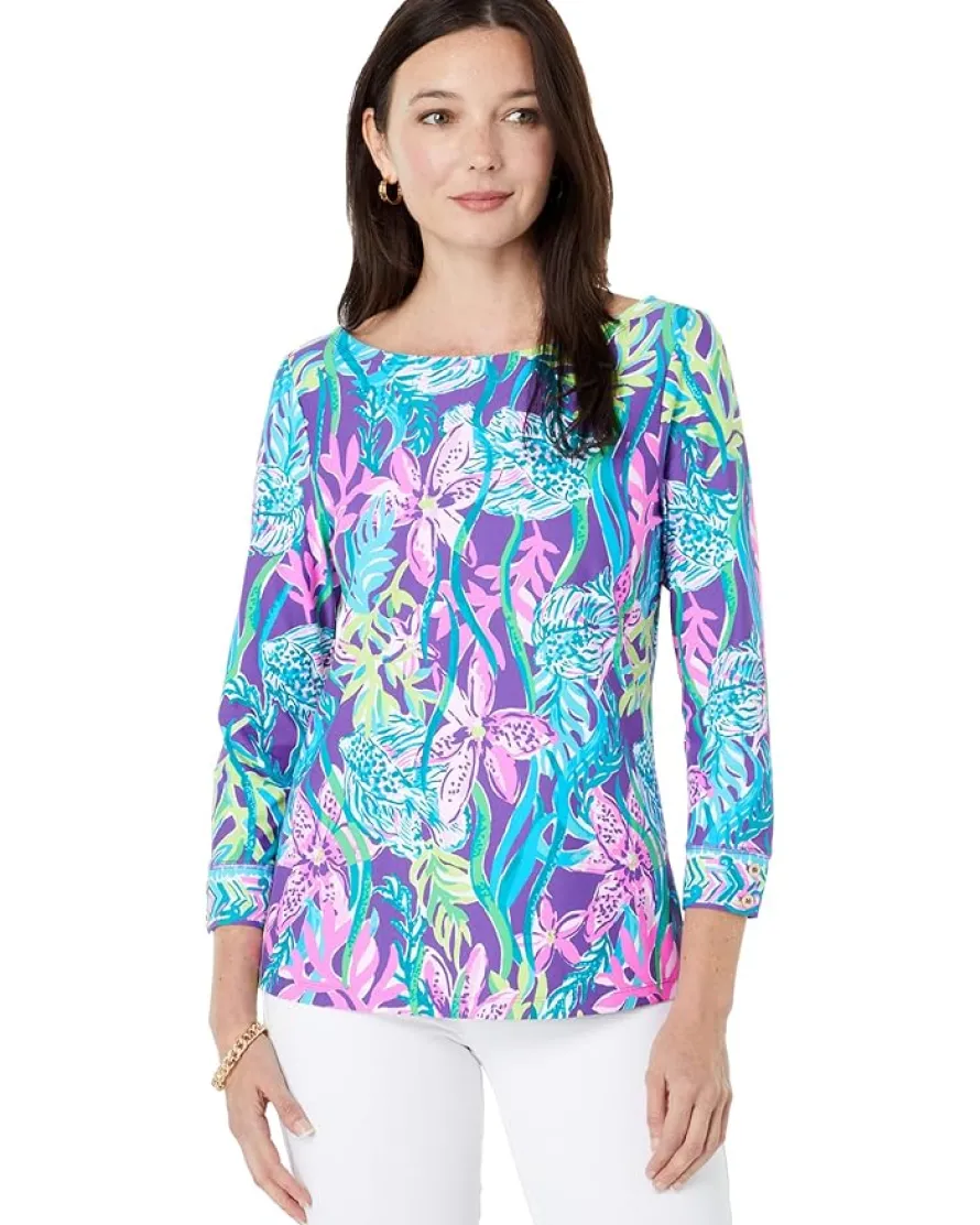 - The Lilly Pulitzer® Everlynn UPF 50+ Top makes your sunny days extra bright and fun! This fitted top is crafted in a printed stretch jersey fabrication, and designed with a boat neckline and button cuffs.