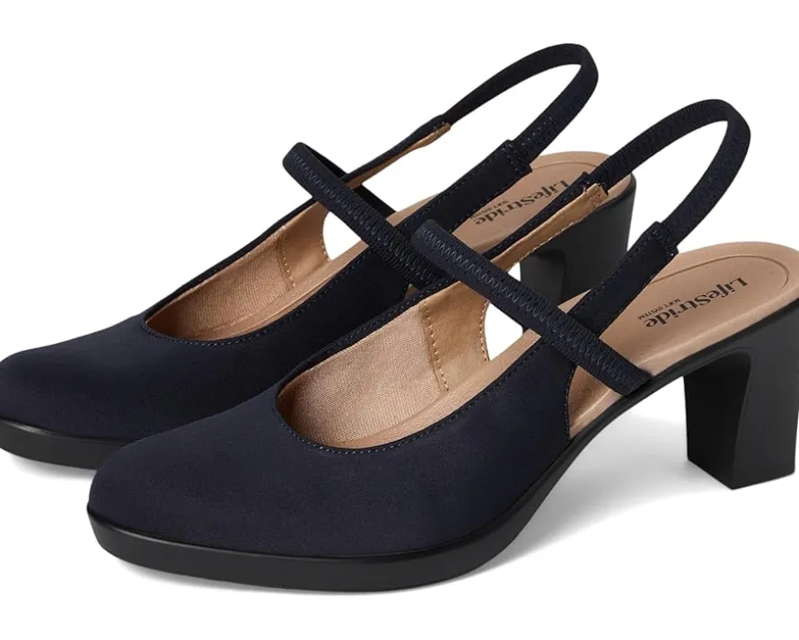 - Modernize your look, whether you’re at the office or out on the town, in these comfortable LifeStride® Evoke Slingback Shoes with an easy block heel. The pumps feature fabric upper with an almond toe design and a stretch gore slingback strap. Trusted Soft System® comfort technology for unmatched cushion, support, and flexibility in every pair. Traction sole provides you with extra stability.