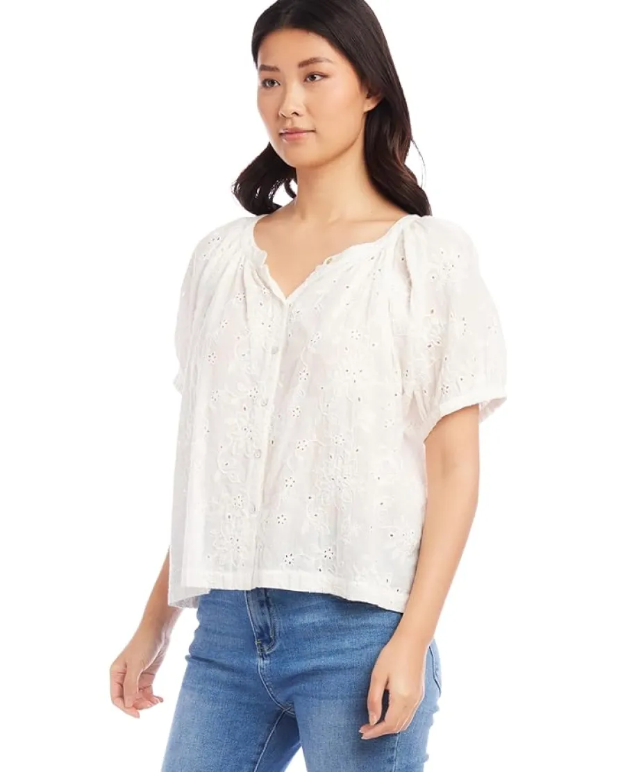 - Dress up for the day picnic with friends wearing the relaxed fit Karen Kane™ Eyelet Peasant Top that features split neckline and look exquisite.