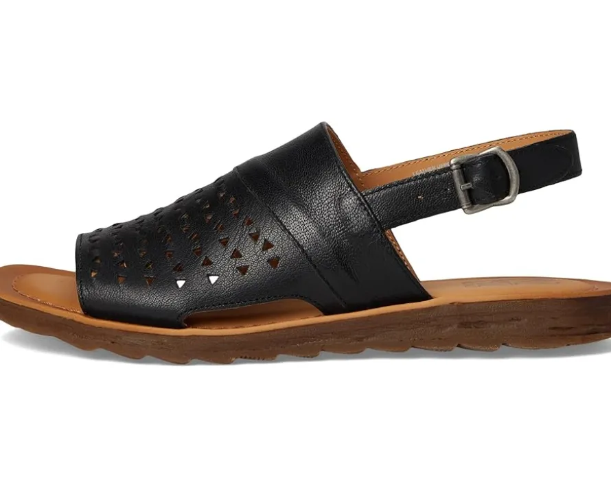 - A unique geometric cutout design offers the Miz Mooz® Felena sandal a chic yet sophisticated look. Designed with a buckle adjustable slingback strap closure, this peep toe style features leather upper and lining construction for all-day comfort.