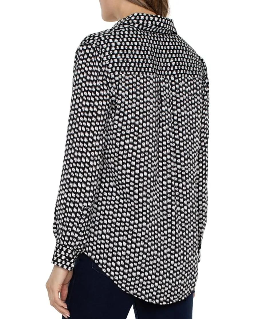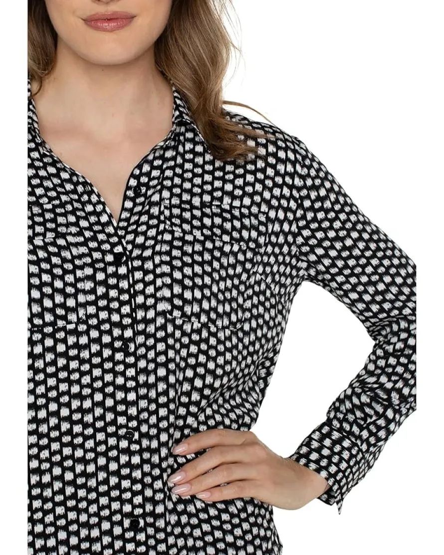 - Elevate your casual wardrobe with the Liverpool™ Flap Pocket Button Front Woven Blouse. This classic top features a spread collar neckline, and long sleeves with buttoned cuffs for a signature look. Crafted from polyester it has an allover dot print.