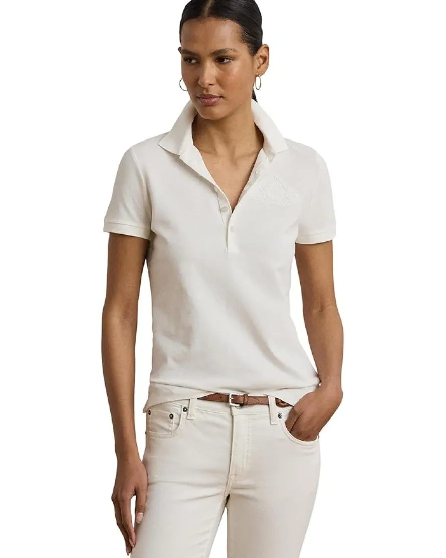 - Synonymous with Lauren Ralph Lauren® style, this version of the stretch-cotton piqué Polo shirt is decorated with a tonal floral logo beaded and embroidered at the chest. Designed in a slim fit that hits at the hip, this Floral-Logo Cottonpiqué Polo Shirt features a classic rib-knit Polo collar and a five-button placket finished with LRL-engraved pearlised buttons. Short sleeves with rib-knit armbands offer a polished touch, while side-split hems add ease of movement. The beaded and embroidered floral motif paired with the signature LRL logo at the chest brings a refined and feminine finish to this timeless wardrobe staple.